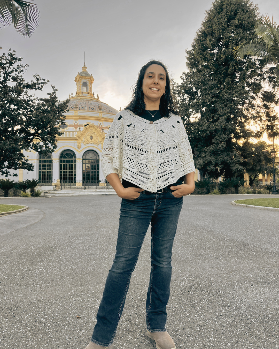 The Sevilla Capelet, by Lizzie (@ambientesencrochet), is one of those pieces that doesn’t go unnoticed. It’s a crochet design meant to be enjoyed—supported by step-by-step video tutorials that guide you round by round.
